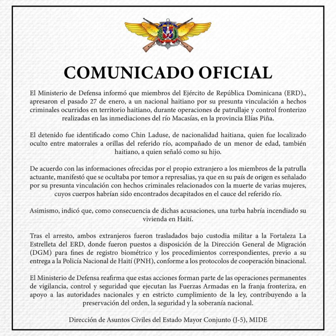 Santo Domingo, R.D. – El Ministerio de Defensa informó que miembros del Ejército de República Dominicana (ERD)., apresaron el pasado 27 de enero, a un nacional haitiano por su presunta vinculación a hechos criminales ocurridos en territorio haitiano, durante operaciones de patrullaje y control fronterizo realizadas en las inmediaciones del río Macasías, en la provincia Elías Piña.
